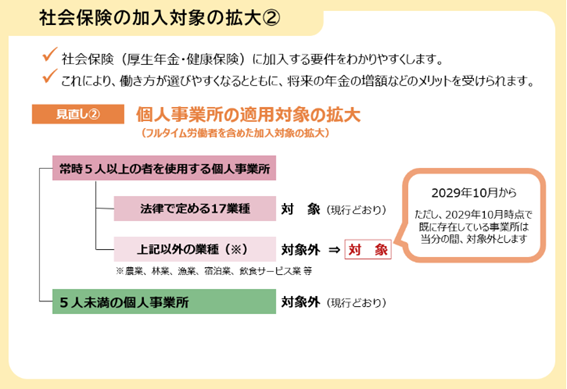 現在は、飲食業・宿泊業・クリーニング業・理美容業などの個人事業所(従業員5人以上であっても)は社会保険の加入義務がありません。しかし、2029年10月からはこれら「非適用業種」を撤廃し、サービス業等の個人事業所もすべて適用対象となります。
